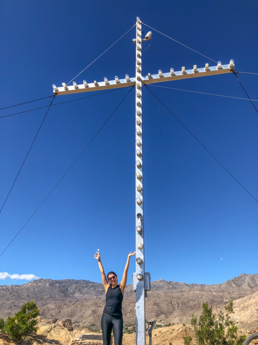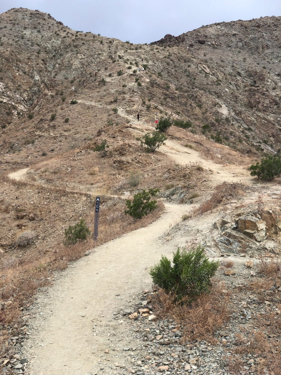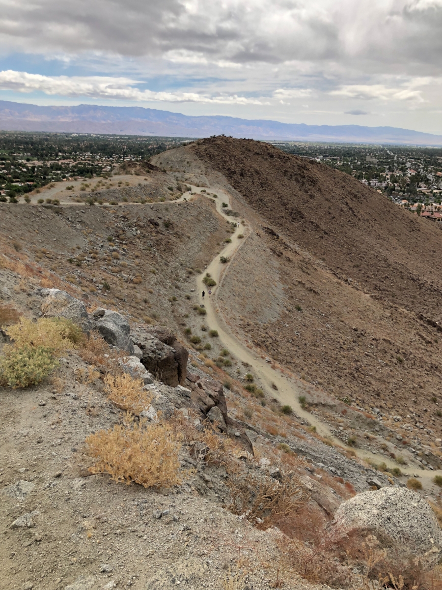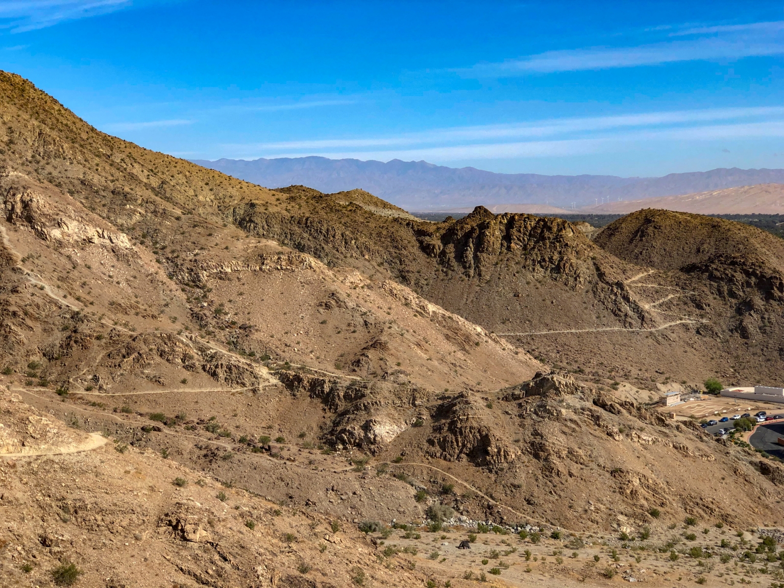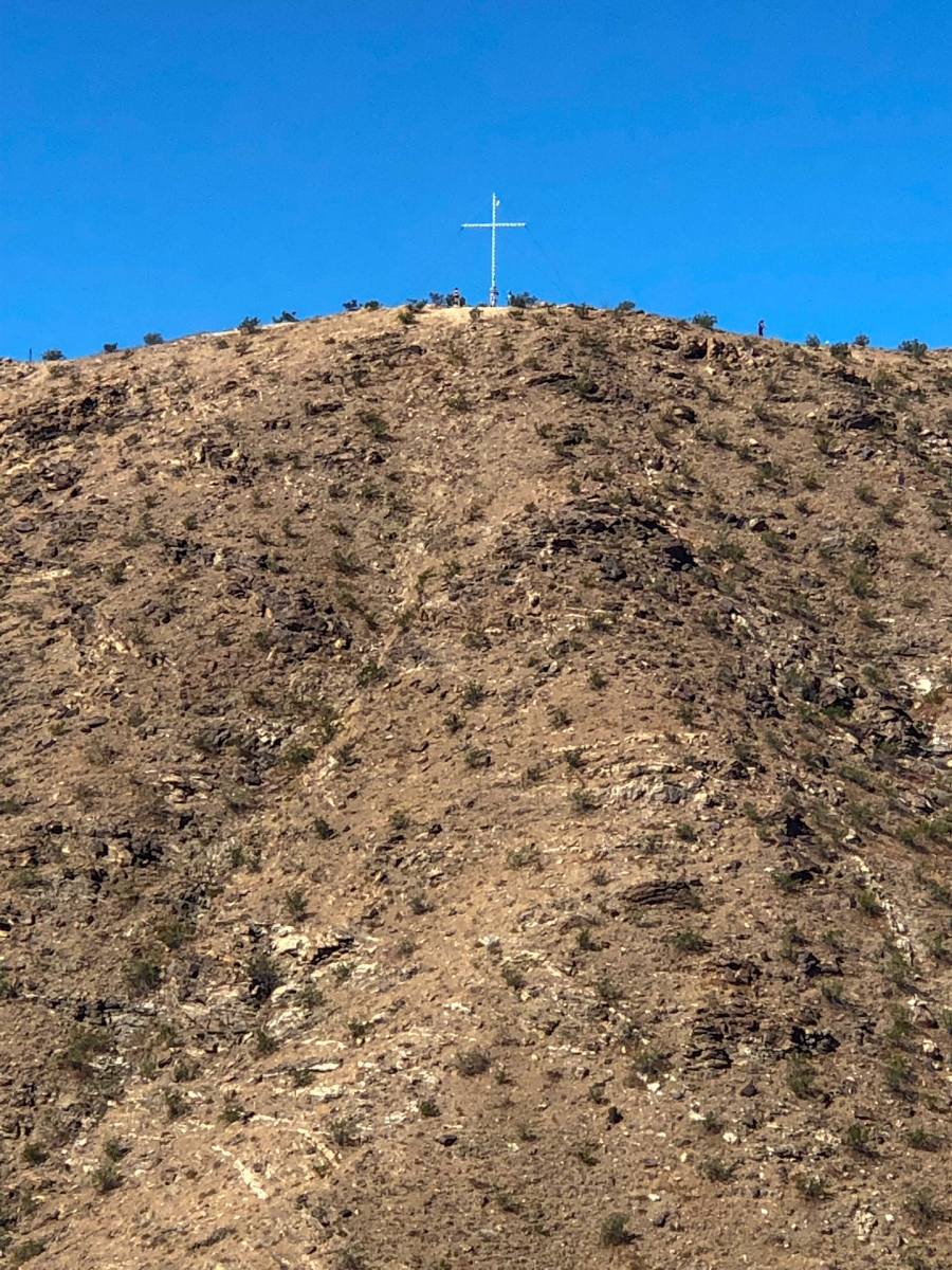 The trail starts behind the Target store in Palm Desert. It has many off-shoots. To head toward the cross, take the trail to the left that is called Hopalong. It will connect to the Cross Loop trail. As you hike you will see a huge cross up on the left which is this hikes turn around spot. On the way up if any doubt stay to the right. On way back if you find you are the Gabby Hayes trail it will take you back to your car but via a wash walk.