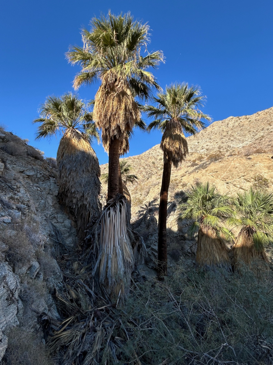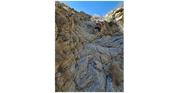 The hike starts at the west end of Foothill Road in Cathedral City. After a very short walk through a sandy wash, we ascend a little-used series of dry rock waterfalls. This Canyon drainage gets very little hiker traffic and is absolutely beautiful! There are approximately 10 rock scrambles in the initial ascent to Dunn Road, each between 10-25 feet high. See the photo of Jeff ascending one of the taller scrambles. (If you’ve done Magnesia Falls, there’s nothing here more difficult than any of those scrambles. If you haven’t scrambled Magnesia Falls and are worried about your ability, please call Jeff and he will describe in more detail what’s involved.)