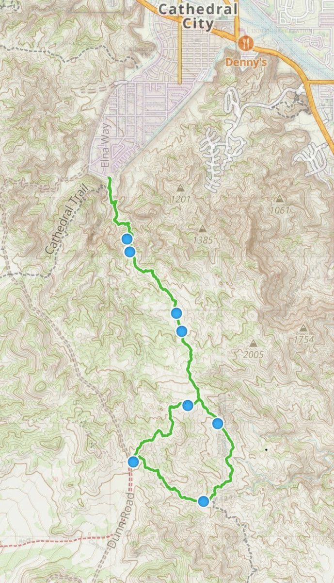 After 4 miles on the trail, we will head off on very faint “trail” toward the Magnesia Falls/Springs drainage. After crossing that canyon, we will continue through an ever-changing Desert and eventually arrive at the Art Smith Trail. We will continue up the Art Smith trail to the picnic tables and have a bite to eat before returning back on the Cathedral Canyon East Trail.