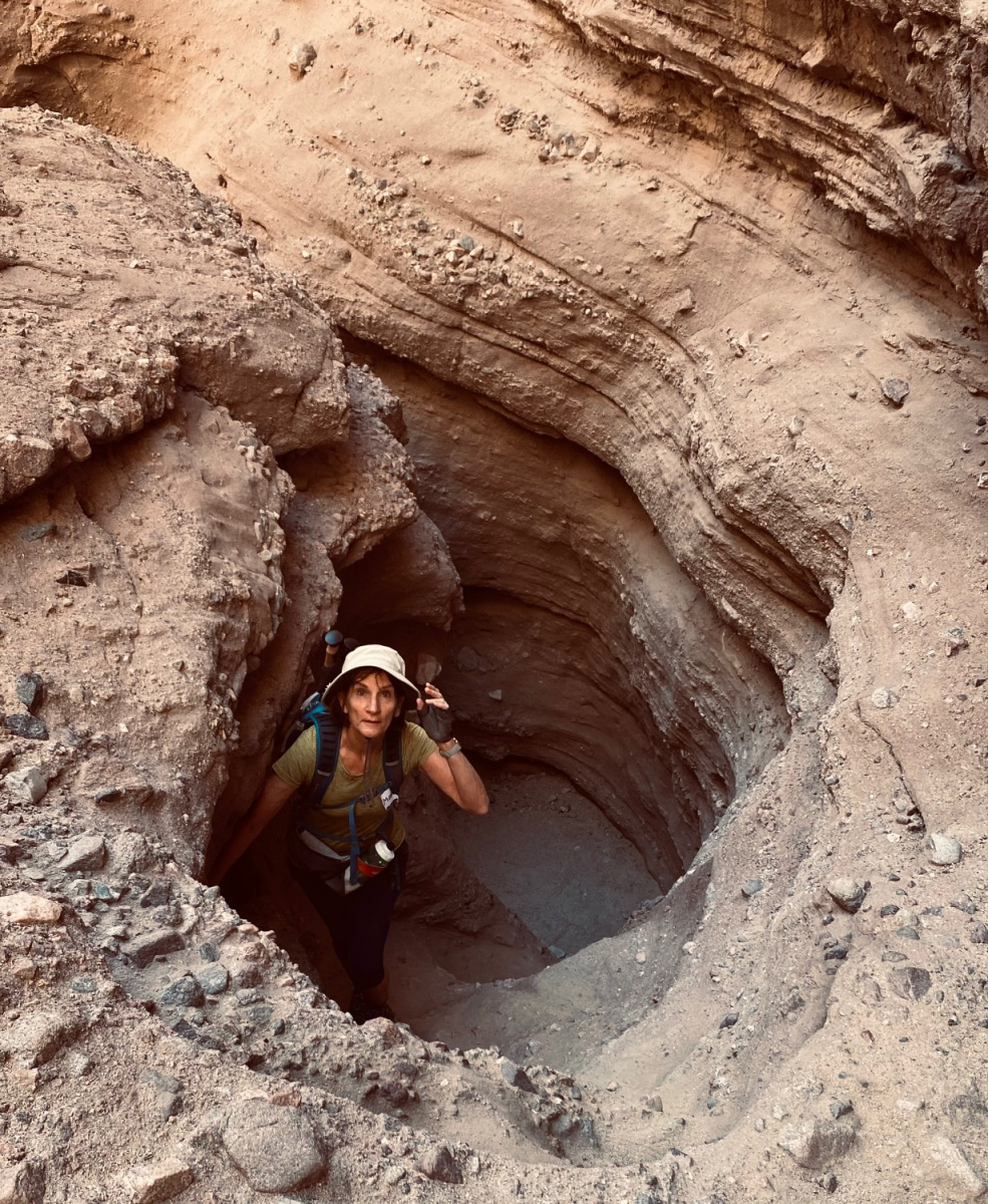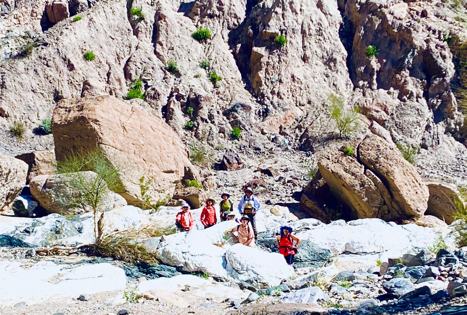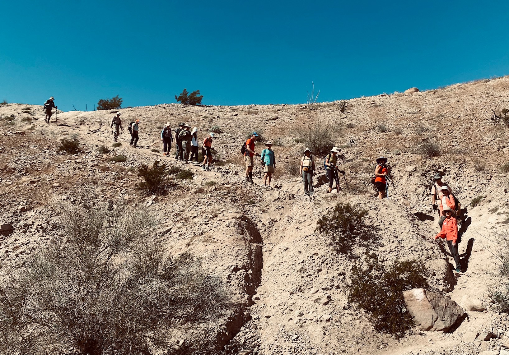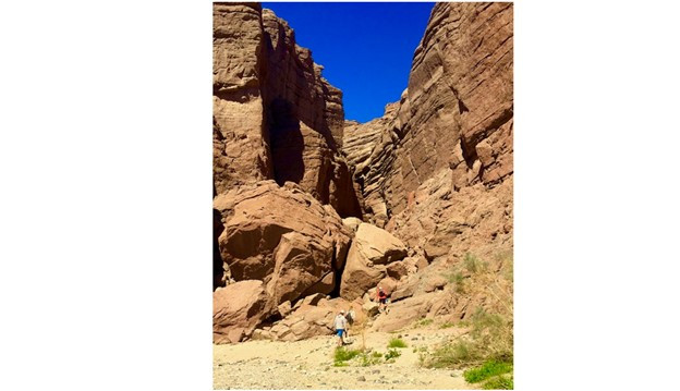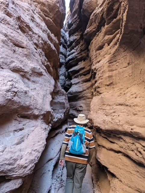 There are several dry waterfalls that must be climbed using tall ladders (15-20 ft.).  Narrow slot canyons open to wider higher canyons leading to an overlook ridge with a view of the Salton Sea.  After proceeding up the ridge for approximately a mile, we drop down into the Big Painted Canyon and wind our way back to the parking lot about two miles away.