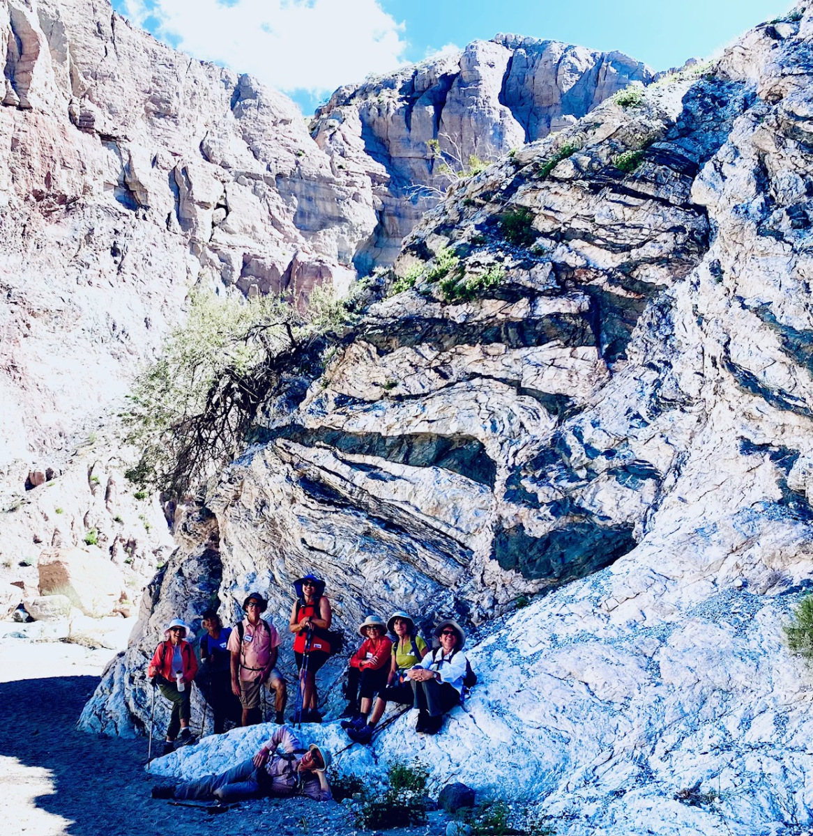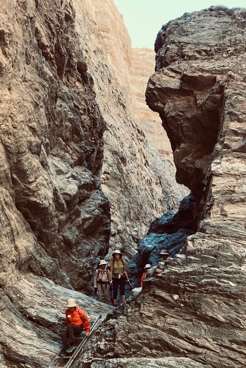 Even though this hike and the pace are rated moderate, it has its challenges.  The beginning of the canyon requires either crawling through a small short tunnel or walking a catwalk about 10 feet long while holding onto the cliff wall to reach the opening of the ladders canyon.